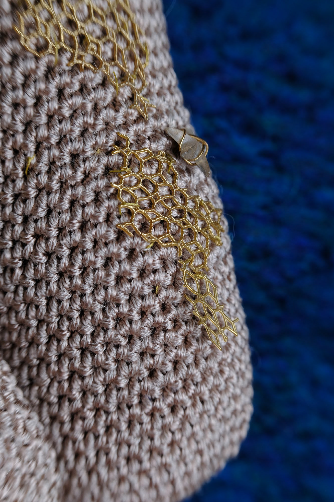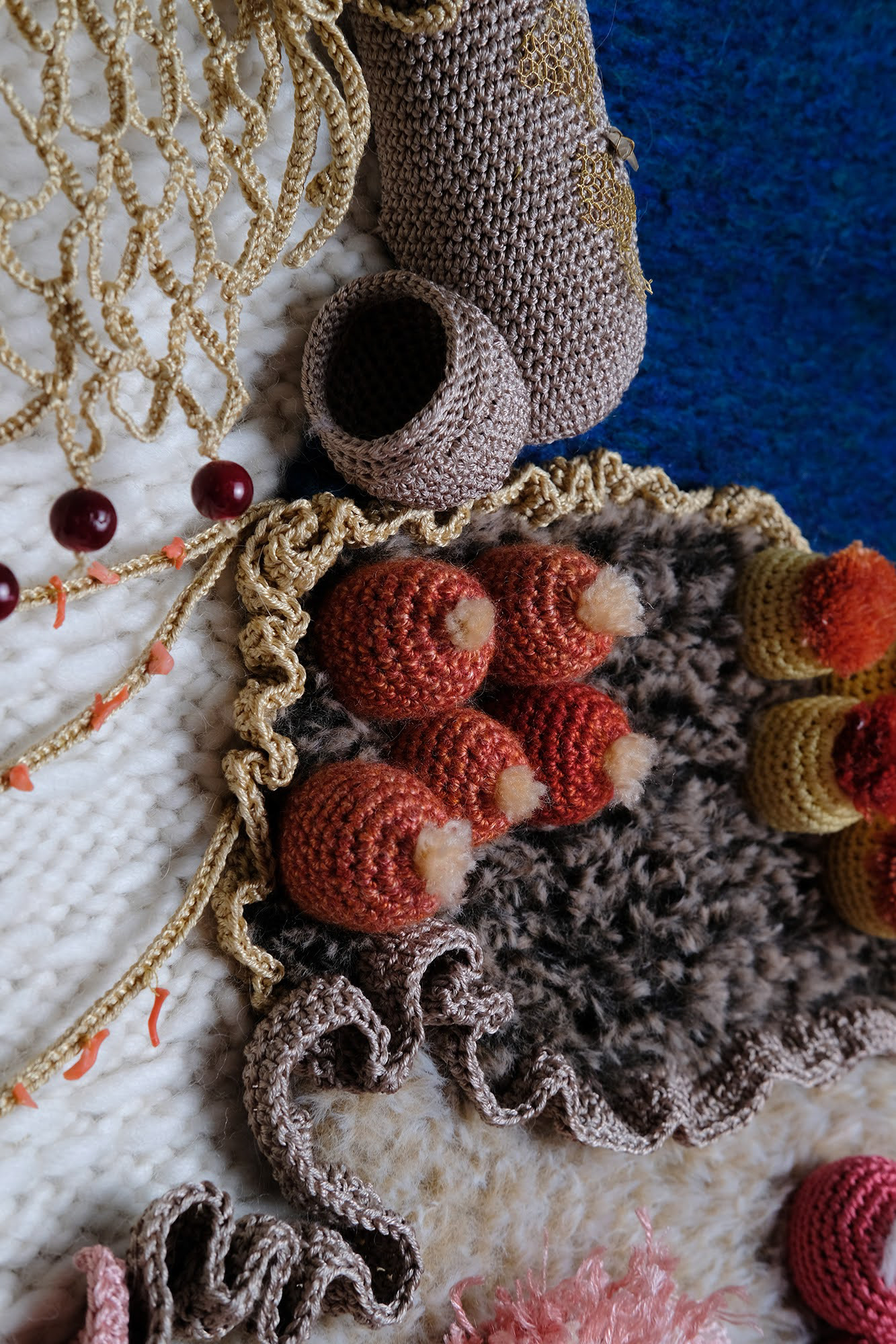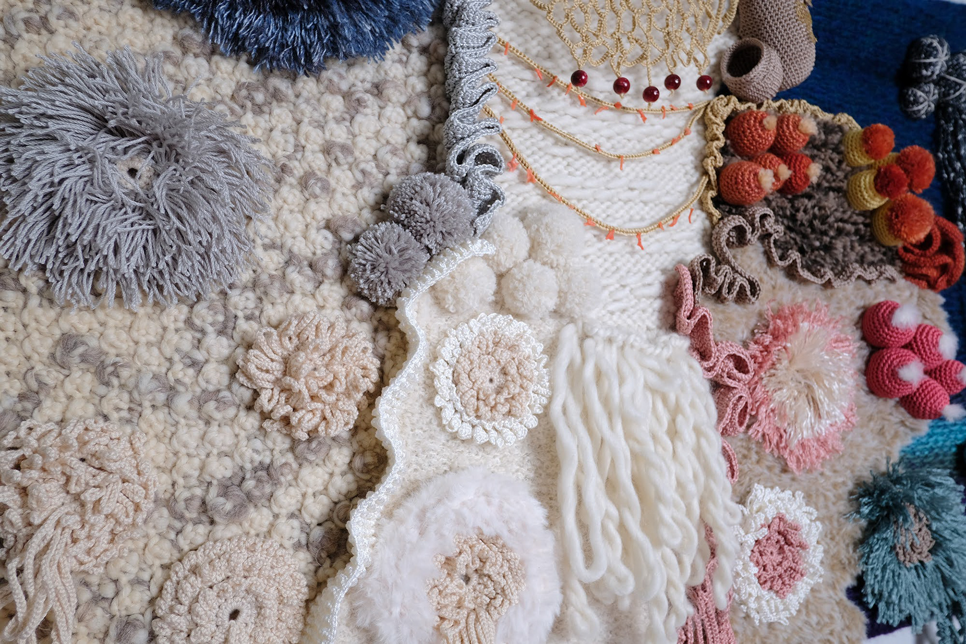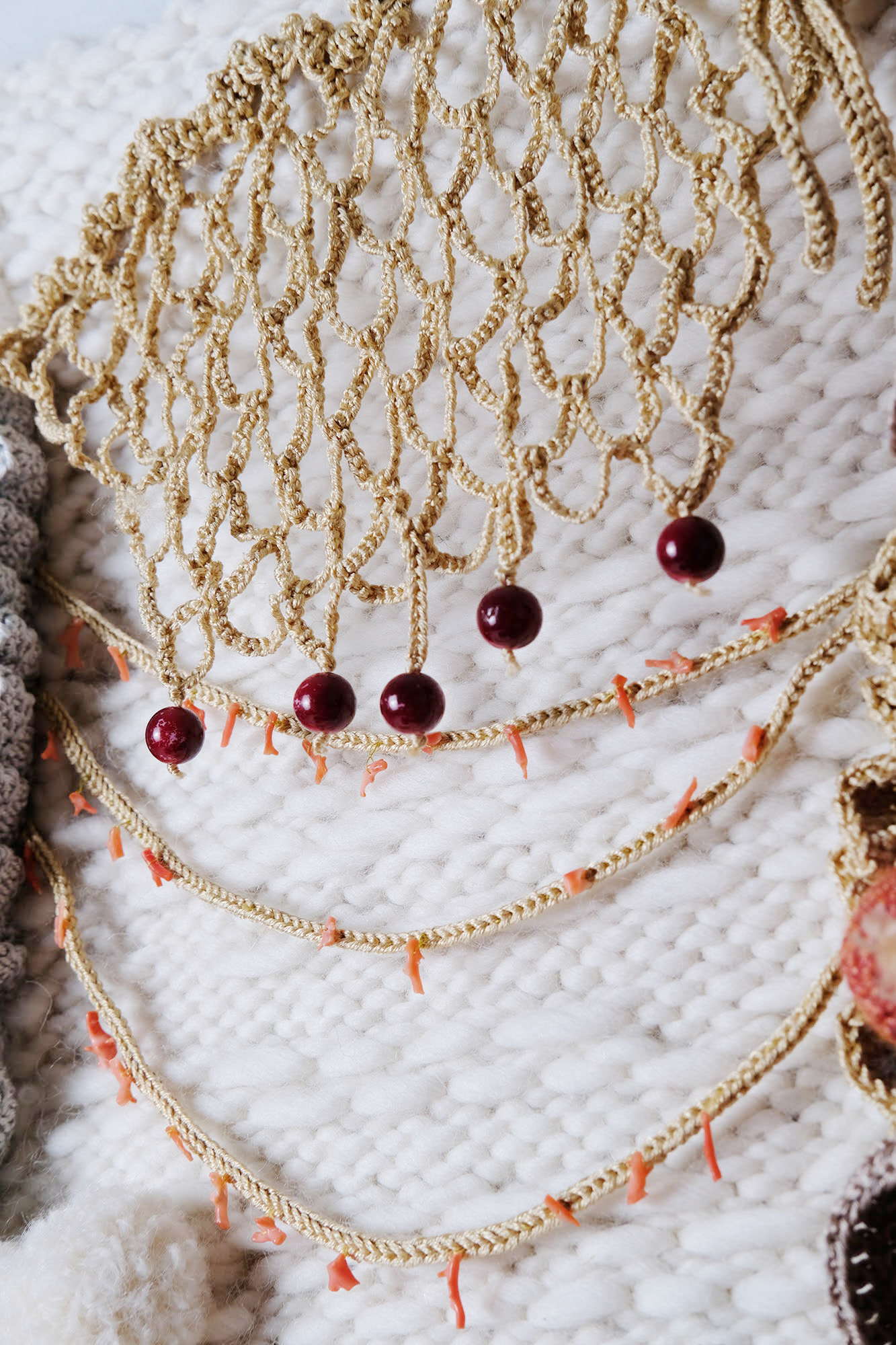 Motivos - Fios de algodão mercerizado grosso; Fio mistura de algodão e seda; Fios 100% lã de espessura robusta; Fio mistura de lã Alpaca e lã Merino, mesclada; Fio mistura de Caxemira e lã; Peças de bijuteria; Fragmentos de coral, fio de prata.