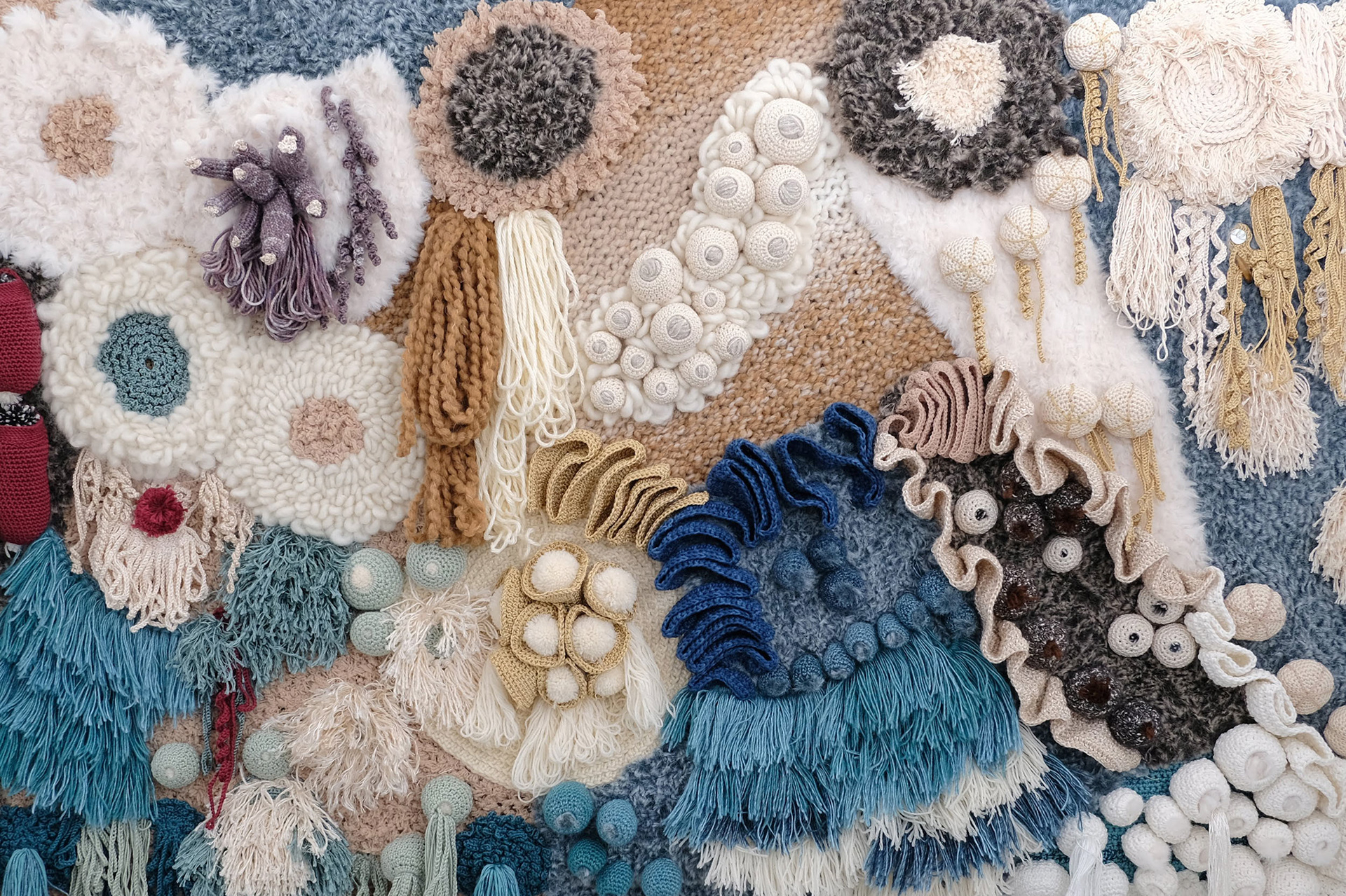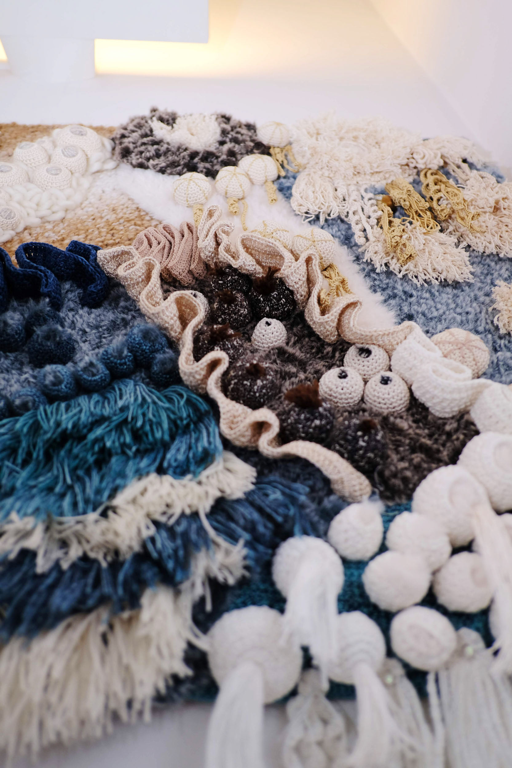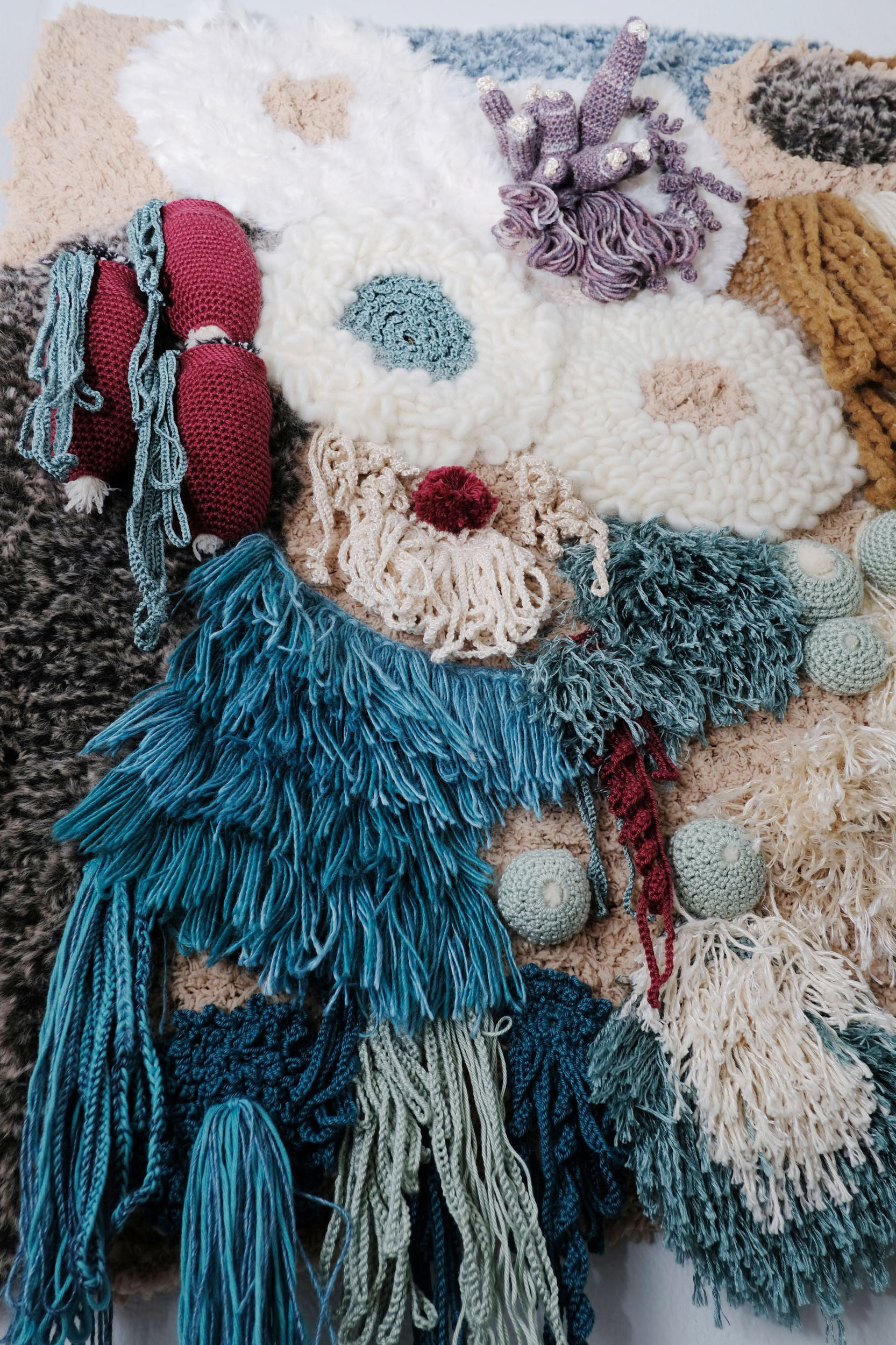 Quando pensei esta peça, vieram-me à ideia as Mantinhas do Cuco com que iniciei a aprendizagem do tricô e do croché na minha infância. Comecei por experimentar várias técnicas, utilizei diferentes tipos de fios e lãs, criei elementos vários sem lógica ou projeto definido, montei e desmontei…
